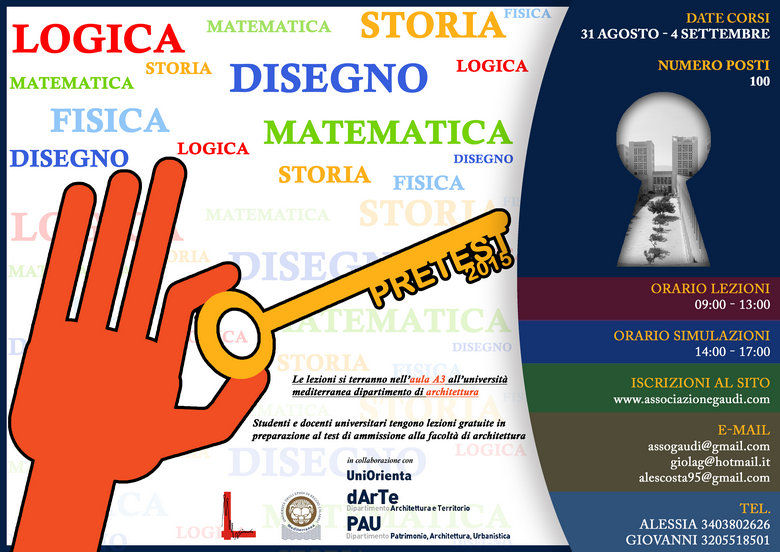 Dal 31 agosto al 4 settembre, dalle ore 9:00 alle ore 17:00, presso l'Aula A3 di Architettura, si terrà una serie di incontri per consentire agli studenti che hanno effettuato la pre-iscrizione online di apprendere l'approccio metodologico indispensabile per affrontare il test con successo.
