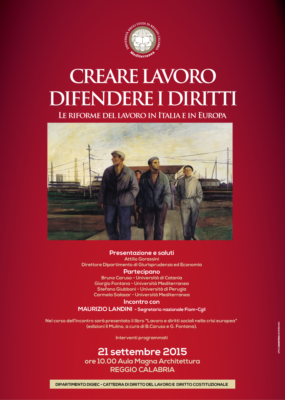 Lunedì 21 settembre dalle ore 10.00, presso l'Aula Magna di Architettura si è svolta la tavola rotonda organizzata dalle cattedre di Diritto del Lavoro e Diritto Costituzionale del Dipartimento DIGIEC dal titolo "Creare lavoro, difendere i diritti. Le riforme del lavoro in Italia e in Europa".