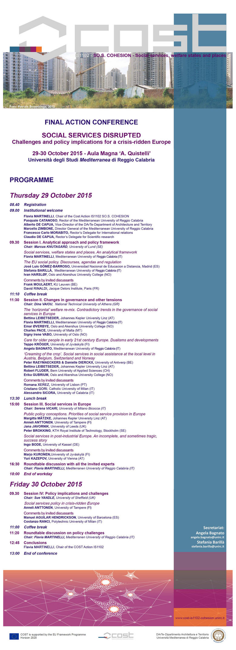 Nei giorni 29-30 ottobre 2015 si terrà a Reggio Calabria, presso l’Aula Magna ‘A. Quistelli’, la Conferenza finale dell’Azione, con la partecipazione anche di esperti esterni e di osservatori dal COST Office di Bruxelles. Nel corso della Conferenza saranno presentati i principali risultati del confronto scientifico sviluppato nel corso dell’Azione. Tali risultati saranno pubblicati dalla casa editrice Edward Elgar in un volume collettaneo dal titolo Social services disrupted. Challenges and policy implications for a crisis-ridden Europe.