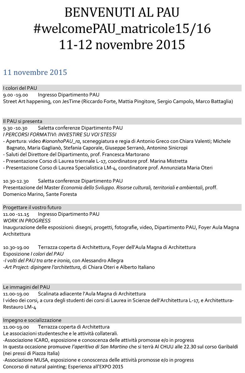 11-12 novembre Benvenuti al PAU - Giornate della Matricola 2015