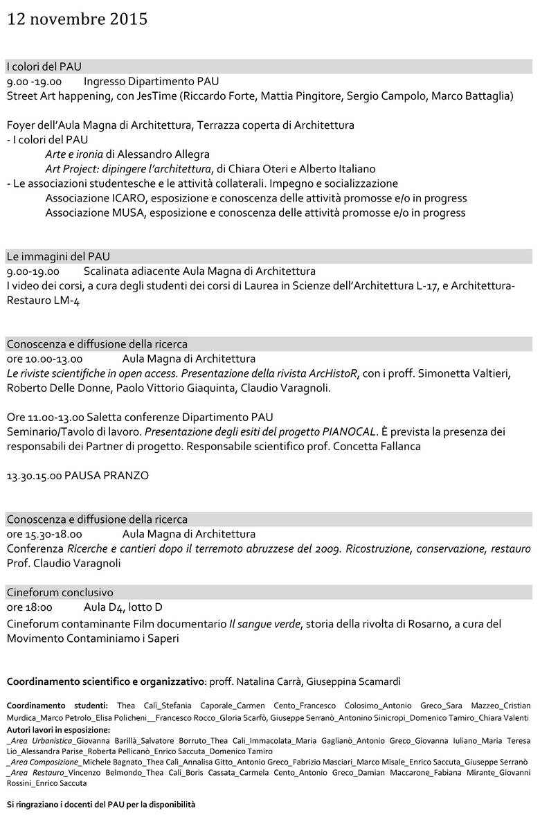 Durante i due giorni, l’intero Dipartimento PAU e alcuni spazi del complesso di Architettura saranno interessati da numerosi eventi culturali e artistici: incontri con gli studenti, seminari, conferenze, ma anche happening di pittura, mostre e performance curate dagli studenti dei due Corsi di laurea.