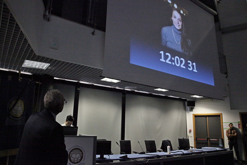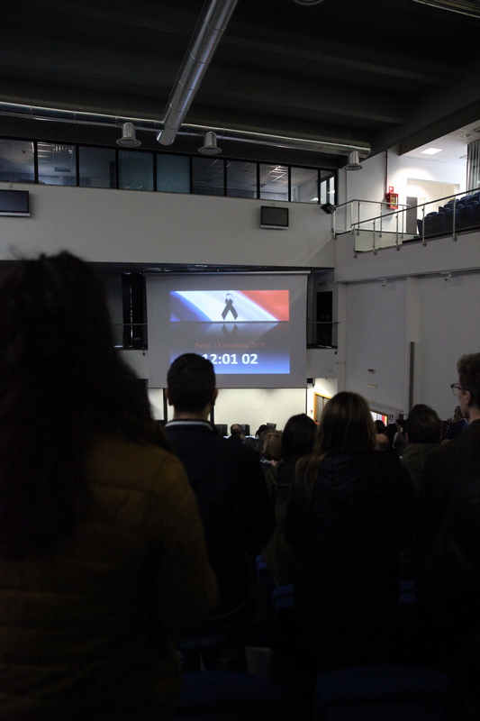 A mezzogiorno, dopo un minuto di raccoglimento e la lettura del messaggio del presidente della Crui Gaetano Manfredi, un lungo applauso ha salutato l’immagine di Valeria Solesin, 28 anni, dottoranda in Demografia all’università Sorbona di Paris e volontaria di Emergency.