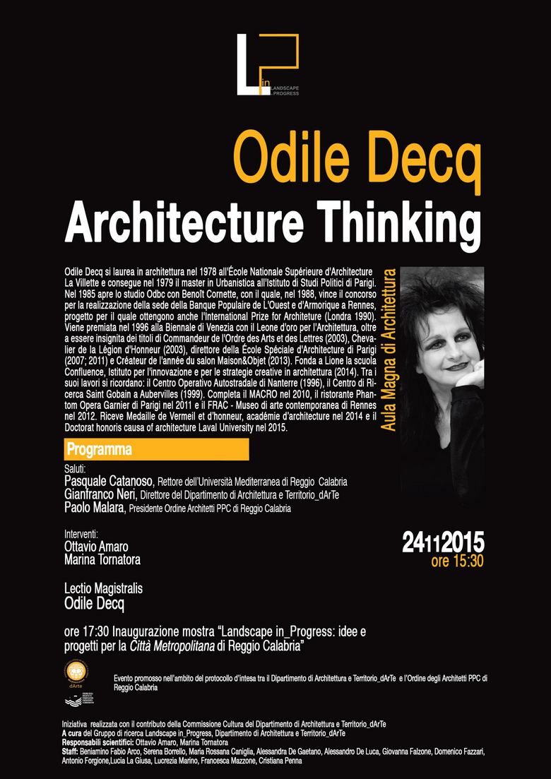 La lectio magistralis di Odile Decq prevista per martedì 24 novembre 2015 alle ore 15.30 nell’Aula magna di Architettura, è organizzata dal gruppo di ricerca Landscape in progress – responsabili scientifici Ottavio Amaro e Marina Tornatora, componenti: Beniamino Fabio Arco, Serena Borrello, Maria Rossana Caniglia, Alessandra De Gaetano, Alessandro De Luca, Giovanna Falzone, Domenico Fazzari, Antonio Forgione,Lucia La Giusa, Lucrezia Marino, Francesca Mazzone, Cristiana Penna.
