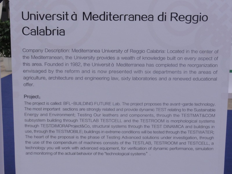 Il BUILDING FUTURE Lab. è stato presentato in diverse sessioni della manifestazione e sono state promosse azioni per la valorizzazione dei servizi tecnologici nelle sessioni di BtoB con i soggetti cinesi, per i quali sono stati allestiti degli stand dedicati alla Mediterranea.
