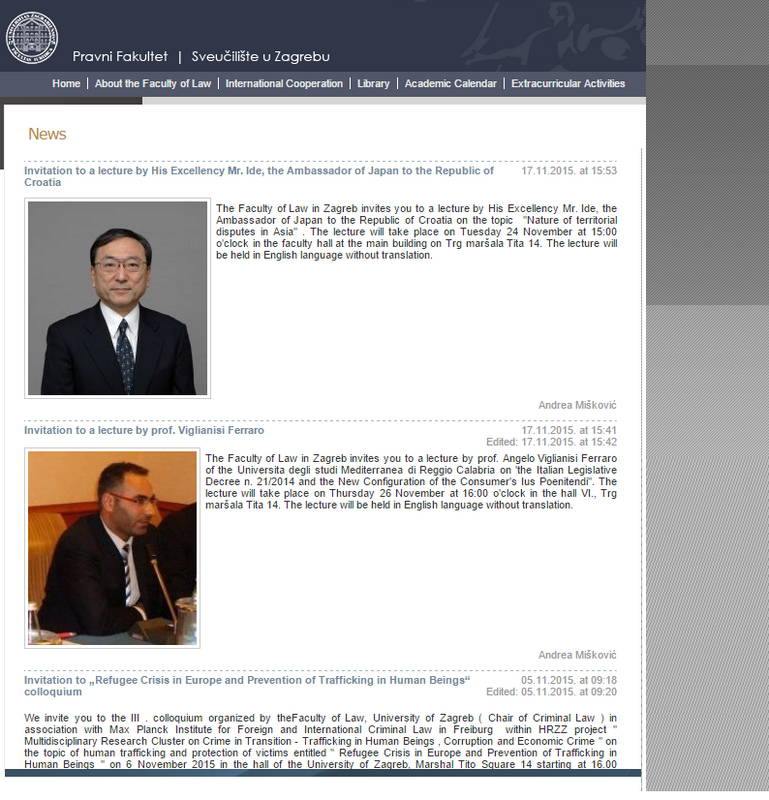 E, sempre a Zagabria, nella Faculty of Law dell’Università statale, si è poi tenuto un meeting di accoglienza, presso il raffinatissimo ufficio del preside, col prof. Davor Derenčinović (delegato Erasmus e direttore di dipartimento, già ad hoc judge presso la Corte europea dei diritti dell’uomo), seguito dalla “Invited lesson" del docente accompagnatore reggino su "The Italian Legislative Decree n. 21/2014 and the New Configuration of the Consumer's Ius Poenitendi".