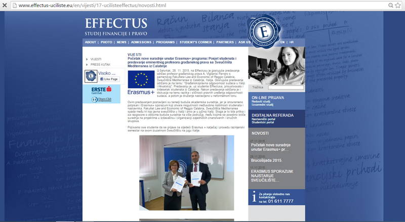 Il 26 novembre, presso la University College EFFECTUS – College for Finance and Law, si è svolto il seminario italo-croato sulla "Civil Liability of Judges in Italy and in Croatia" (organizzato dalla prof.ssa Jelena Uzelac, Vice-preside dell’Ateneo privato), che ha visto gli studenti reggini e quelli croati confrontarsi con i loro colleghi e con i docenti presenti in aula circa le ultime novità legislative in materia di responsabilità civile dei magistrati (http://effectus-uciliste.eu/novosti/710-po%C4%8Detak-nove-suradnje-unutar-erazmus-programa-posjet-studenata-i-predavanje-eminentnog-profesora-gra%C4%91anskog-prava-sa-sveu%C4%8Dili%C5%A1ta-mediterranea-iz-calabrije.html).