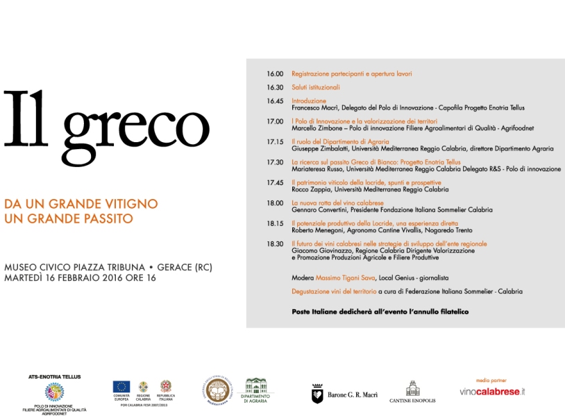 L’evento “Il Greco. Da un grande vitigno un grande passito”, in programma martedì 16 febbraio a Gerace, al Museo Civico, è l’occasione per focalizzare l’attenzione attorno all’areale produttivo del vitigno storico e fare il punto sulla ricerca condotta dal partenariato.