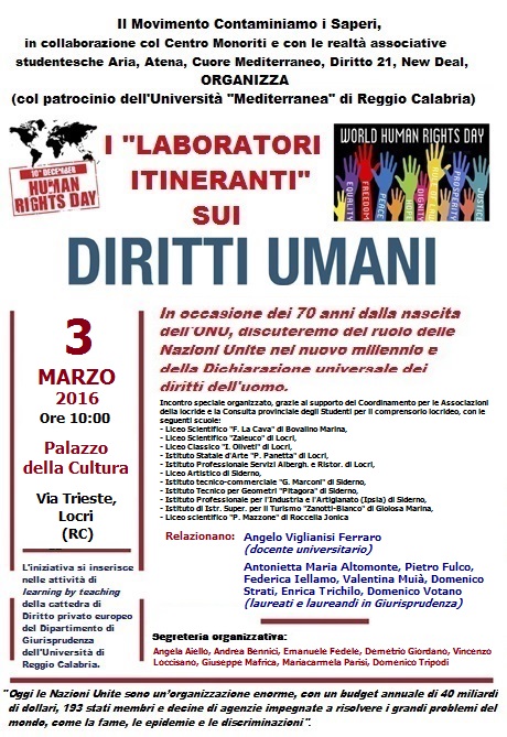 Il Progetto “Laboratori itineranti sui diritti umani”, al quale hanno già aderito oltre 20 istituti di istruzione secondaria di tutta la provincia di Reggio Calabria, è nato nel mese di ottobre del 2015 per celebrare i 70 anni dell’ONU.