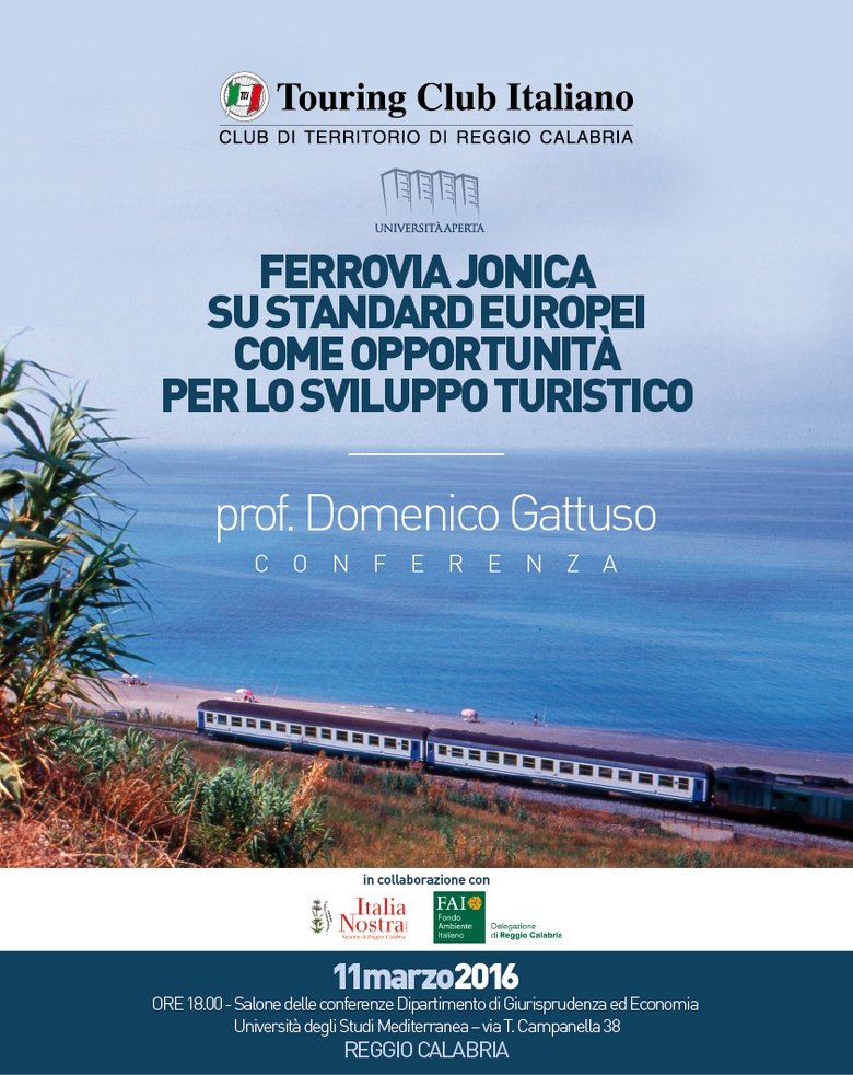 Venerdì 11 marzo 2016 alle ore 18.00 nel Salone delle conferenze del Dipartimento di Giurisprudenza ed Economia dell’Università degli Studi Mediterranea – via T. Campanella n°38 - avrà luogo la conferenza "Ferrovia Jonica su standard europei come opportunità per lo sviluppo turistico" del prof. Domenico Gattuso – ordinario di Trasporti del DIIES.