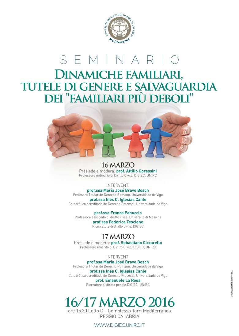 Il 16 e 17 marzo, presso il lotto D, si svolgerà il seminario internazionale Dinamiche familiari, tutela di genere e salvaguardia del “familiare debole” organizzato dalla cattedra di diritto civile, nell’ambito del programma del corso 2015/2016 dedicato ai mutamenti ed alle evoluzioni del diritto di famiglia.