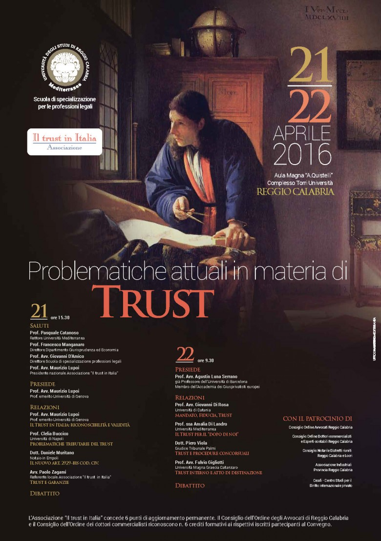 Giovedì 21 (con inizio alle ore 15,30) e Venerdì 22 aprile (con inizio alle ore 9,30) si svolgerà, presso l’Aula Magna “Quistelli” dell’Università di Reggio Calabria, il convegno su “Problematiche attuali in materia di Trust”, organizzato dalla Scuola di specializzazione per le professioni legali, diretta dal prof. Giovanni D’Amico, in collaborazione con l’Associazione “Il trust in Italia”.