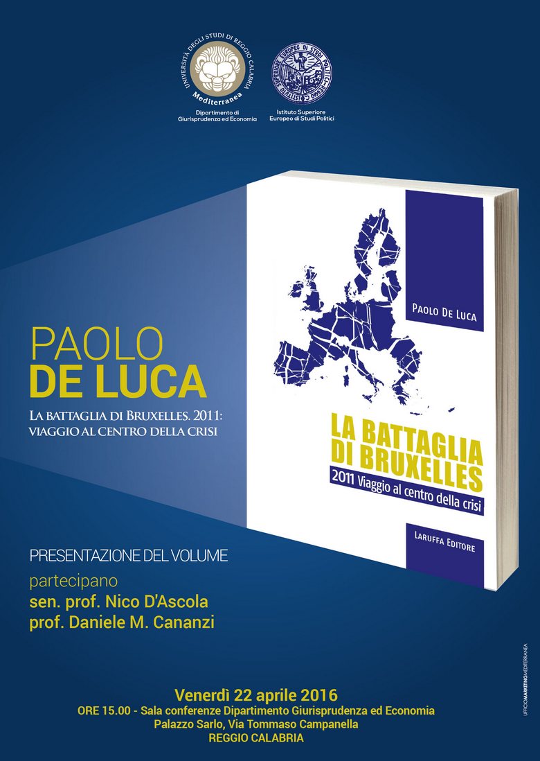 Venerdì 22 aprile 2016 alle 15.00 nella Sala conferenze del DiGiEcPaolo (Palazzo Sarlo), il giornalista Paolo De Luca presenta il libro "La battaglia di Bruxelles. 2011: viaggio al centro della crisi".