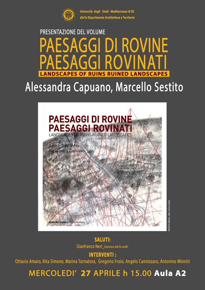 La presentazione del volume Paesaggi di rovine, Paesaggi rovinati a cura di Alessandra Capuano (ed. Quodlibet studio città e paesaggio, Roma 2014), promossa dal Dipartimento dArTe, mira a continuare un confronto nazionale, sviluppato nell’ambito della ricerca PRIN e presente negli interessi e nelle tematiche del dipartimento stesso, attraverso il Dottorato di Ricerca, le tesi di laurea e i corsi didattici.