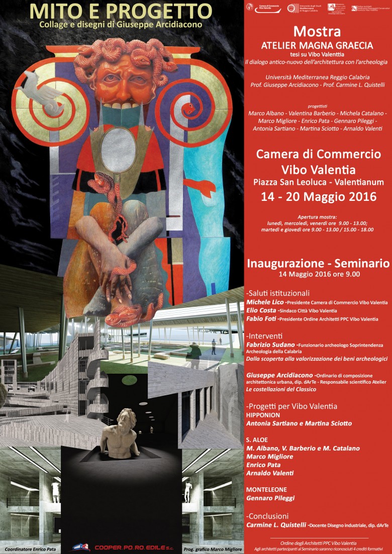 La Mostra e il Seminario di studio ad essa abbinato propongono una lettura pluridisciplinare -in termini figurativi, architettonici, urbanistici- del patrimonio archeologico di Vibo Valentia e dell’immaginario collettivo, simbolico, mitologico, ad esso collegato. Il mito inscritto nei luoghi dà voce ai luoghi, li nomina, li estrae dal rumore di fondo per identificarli; e poi li mette in circolo -nell’eco della lingua- per farli parlare: far “parlare” i luoghi attraverso il progetto costituisce anche il motivo conduttore e il fine della Mostra-Seminario, che indaga e approfondisce il dialogo tra Antico e Nuovo in architettura, applicandolo al contesto urbano di Vibo V. ed ai suoi siti archeologici, ricchi di importanti collezioni e di risorse naturalistiche attualmente neglette dal pubblico. I progetti dell’Atelier Magna Graecia, sono proposti come strumenti di conoscenza che esprimono un giudizio sulla realtà, e intervengono contemporaneamente con autonomia di giudizio nei processi di trasformazione: per suggerire occasioni di recupero del centro storico della città e di ripensamento dell’espansione edilizia contemporanea, governando questi fenomeni con soluzioni formali che sappiano contemperare le ragioni della conservazione del paesaggio culturale con quelle dello sviluppo urbano. La tutela e la conservazione di questo patrimonio urbano stratificato ha costituito fino ad oggi solo un problema per la definizione/espansione della città moderna; ma deve trasformarsi in una opportunità/risorsa per la configurazione della città contemporanea: che è una sola, è la città del presente che contiene tutte le città del passato e deve trasmetterle alla città dei nostri figli.
