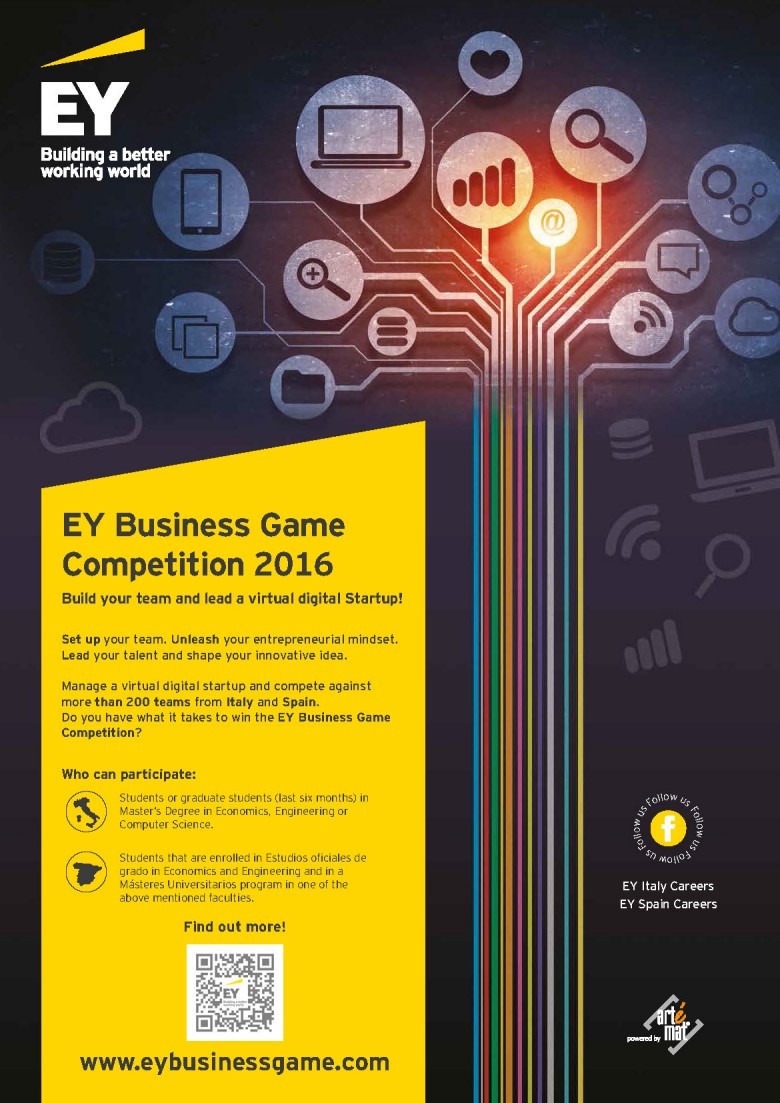 Ha preso avvio la quarta edizione dell’EY Business Game, una competizione che coinvolge tutte le Università italiane e spagnole e che, in modo dinamico e interattivo, dà la possibilità ai partecipanti di simulare la gestione di una start up operante nel settore Digital. L’evento EY Business Game 2016 per l’Italia è rivolto in particolare a studenti iscritti a lauree magistrali, o laureati magistrali da massimo 6 mesi, in Economia e in Ingegneria delle Università Italiane.