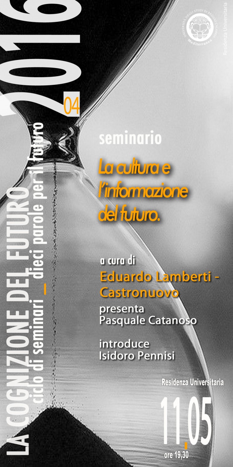 Quest’anno, presso la Biblioteca della Residenza Universitaria di via Manfroce, si svolge un ciclo di seminari dal titolo “LA COGNIZIONE DEL FUTURO”. Si tratta di una serie d’incontri e approfondimenti multidisciplinari che, partendo da punti di vista diversi, presentano e descrivono visioni del futuro su diversi argomenti e problematiche tipiche della contemporaneità .