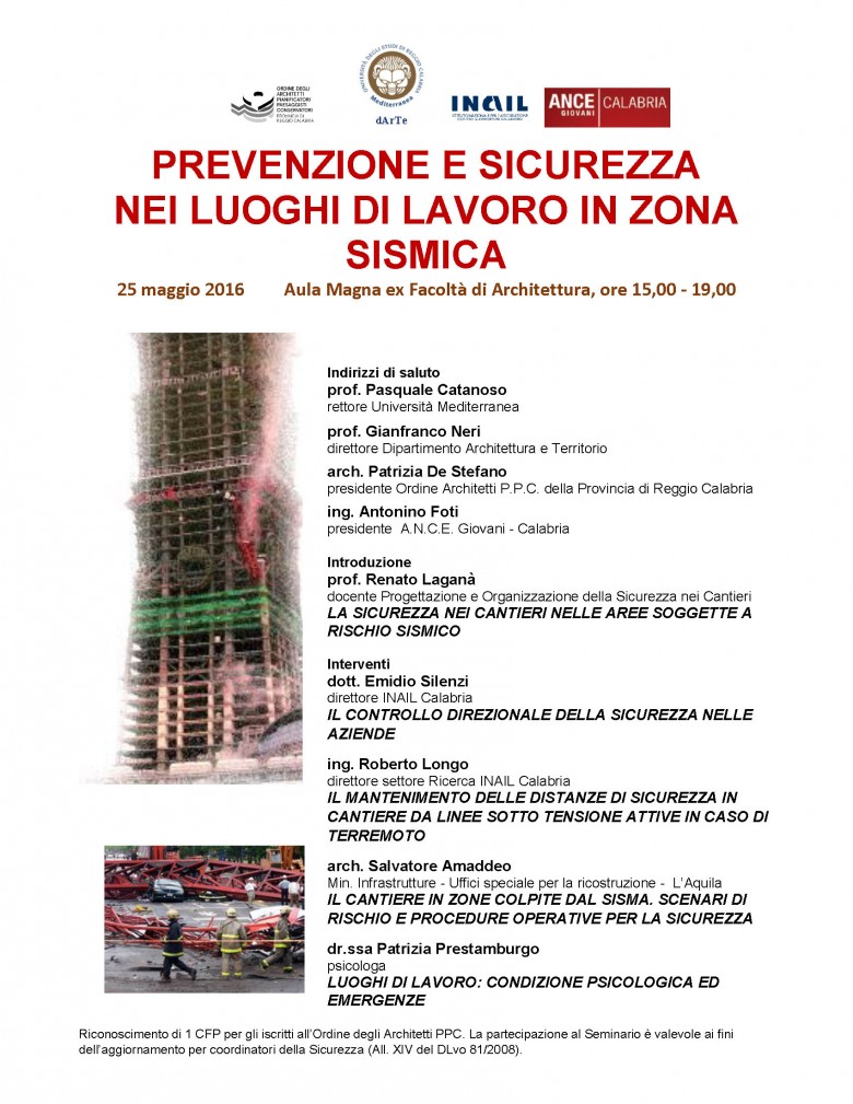 Il 25 maggio dalle 15.00 alle 19.00, si terrà il seminario su "Prevenzione e Sicurezza nei Luoghi di Lavoro in Zona Sismica", presso l'Aula magna di Architettura.