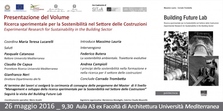 Giovedì 26 maggio, a partire dalle ore 9,30, si terrà presso l’aula A3 dell’Ex Facoltà di Architettura la presentazione del volume Building Future Lab. Ricerca sperimentale per la Sostenibilità nel settore delle Costruzioni, curato da Massimo Lauria e Corrado Trombetta.