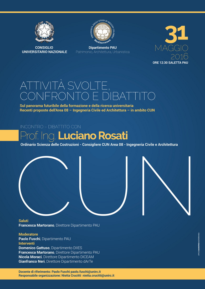 Nel corso dell’incontro verranno brevemente illustrate le recenti attività del CUN, in particolare la proposta di “manutenzione” della Legge 240, cosiddetta Legge Gelmini. Più in generale si discuterà di alcune iniziative promosse dall’Area 08 - Ingegneria Civile ed Architettura – ovvero