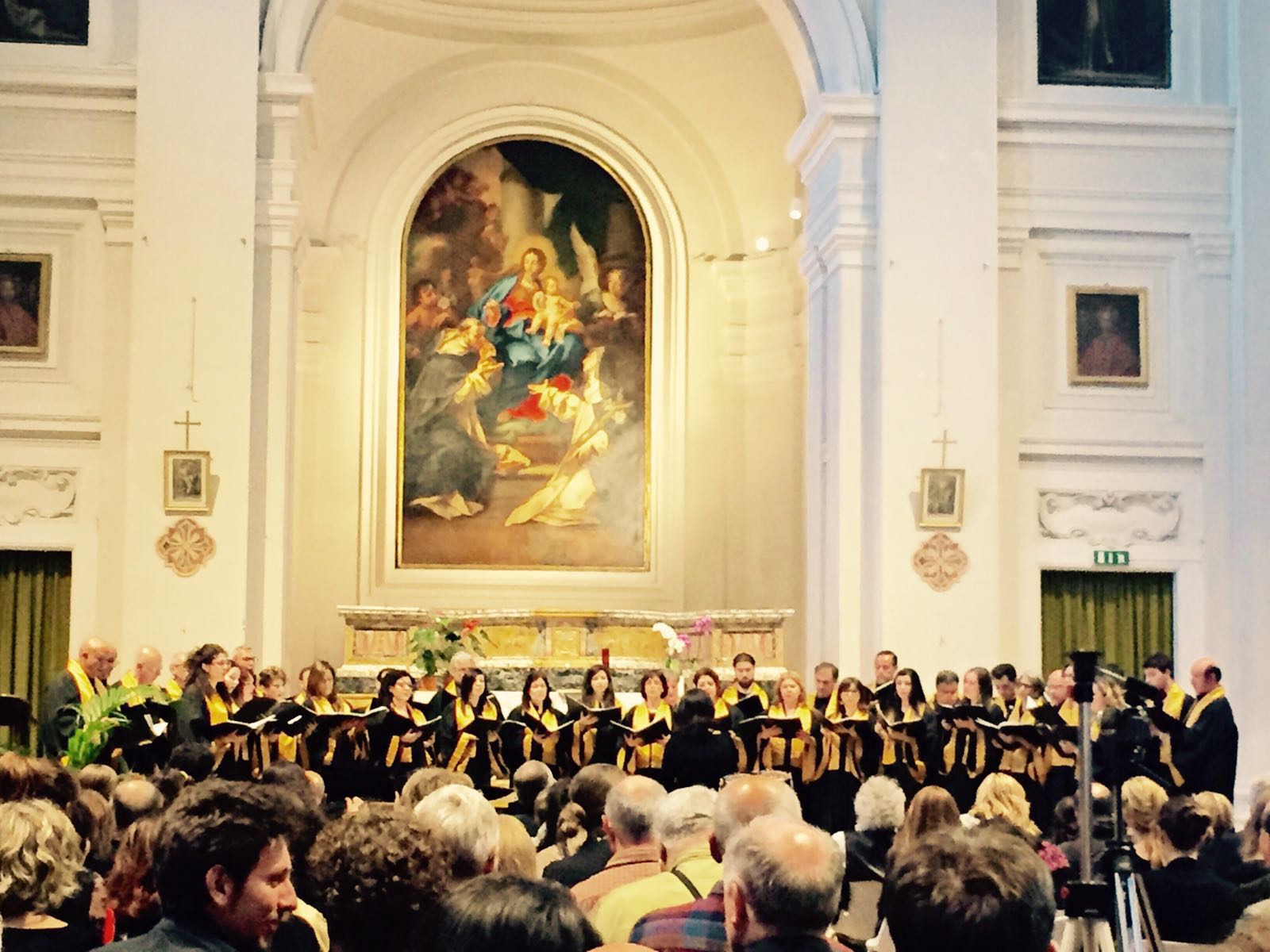 Infine, il Coro della Mediterranea si è congedato dalla Rassegna Nazionale dei cori Universitari di Urbino con il concerto finale tenutosi nella chiesa di San Domenico. Esibitosi per ultimo, subito prima del brano di insieme , l’imponente Fortuna Imperatrix Mundi eseguito a cori uniti, ha salutato la rassegna con alcuni dei brani più classici del suo repertorio, proponendo autori come Bach ed Arcadelt.