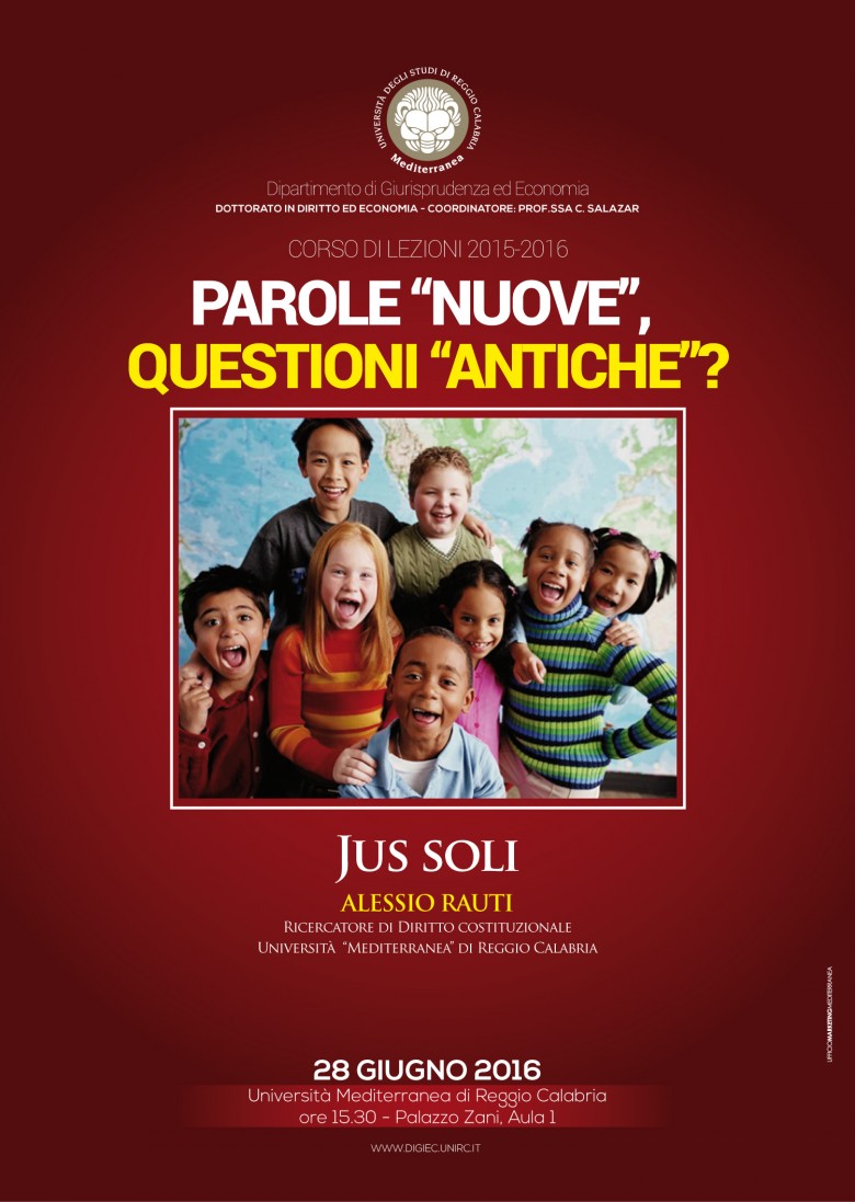 Si chiude il primo ciclo di lezioni sul tema Parole "nuove", questioni "antiche"?, organizzato per il Dottorato in Diritto ed Economia dal coordinatore, professoressa C. Salazar. "Livelli essenziali delle prestazioni" e "jus soli" sono le "parole nuove" su cui rifletteranno, rispettivamente, i professori C. Panzera e A. Rauti.