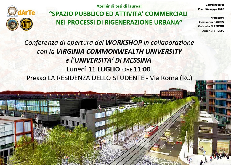 Il Workshop, organizzato in collaborazione con la Virginia Commonwealth University di Richmond e l’Università di Messina, ha come tema la rigenerazione urbana di tre aree individuate all’interno del comune di Messina, caratterizzate da una significativa presenza di attività commerciali che, adeguatamente valorizzate e sviluppate, possono rappresentare uno dei motori per la riqualificazione urbana.