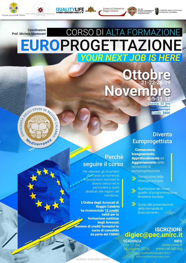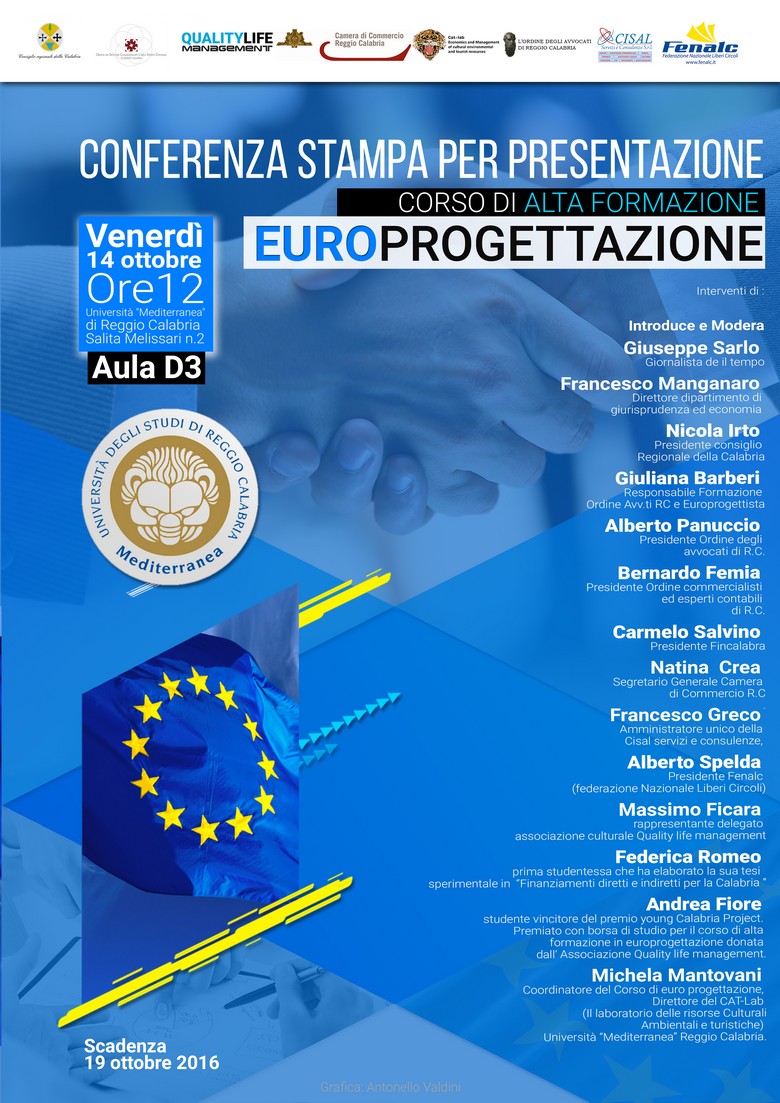 Il Corso di Alta Formazione in Europrogettazione è organizzato dal Dipartimento di Giurisprudenza ed Economia, dal CAT- Lab, laboratorio di Economia e management delle risorse culturali, ambientali e turistiche, dell'Università Mediterranea di Reggio Calabria e dall’associazione Quality life management.