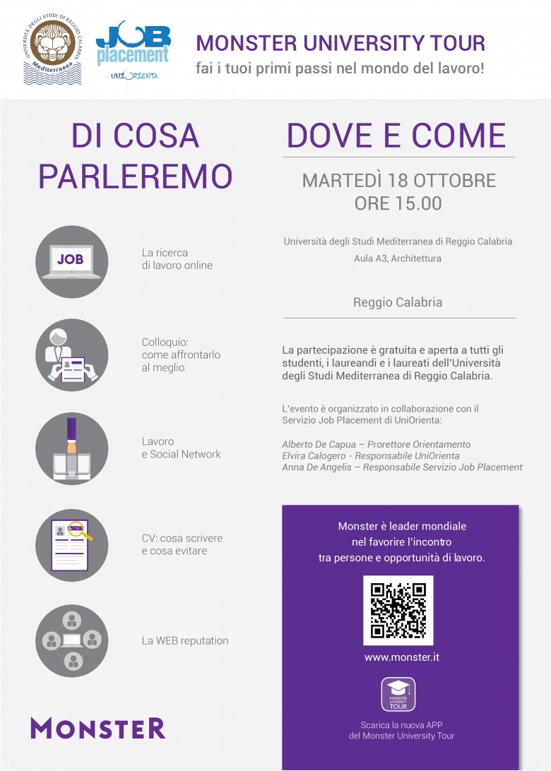 MONSTER UNIVERSITY TOUR 2016 → la formazione dedicata a studenti, laureandi e laureati della Mediterranea curata dagli esperti di MONSTER che affronteranno temi come la ricerca di lavoro online e all’estero, come affrontare al meglio il colloquio di lavoro, cosa scrivere e cosa evitare nel CV, come migliorare la propria reputazione sul web, come sfruttare internet per la ricerca di lavoro.