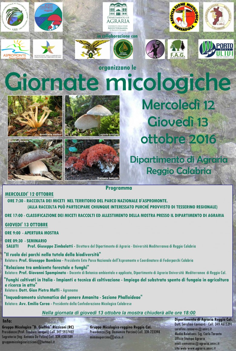 Il 12 e 13 ottobre, il Dipartimento di Agraria ospita la terza edizione delle Giornate micologiche, organizzata con l’Ente Parco Nazionale dell’Aspromonte e i gruppi micologici AMB di Rizziconi e Reggio Calabria afferenti all’Associazione “Bresadola” di Trento e alla Confederazione Micologica Regionale della Calabria.