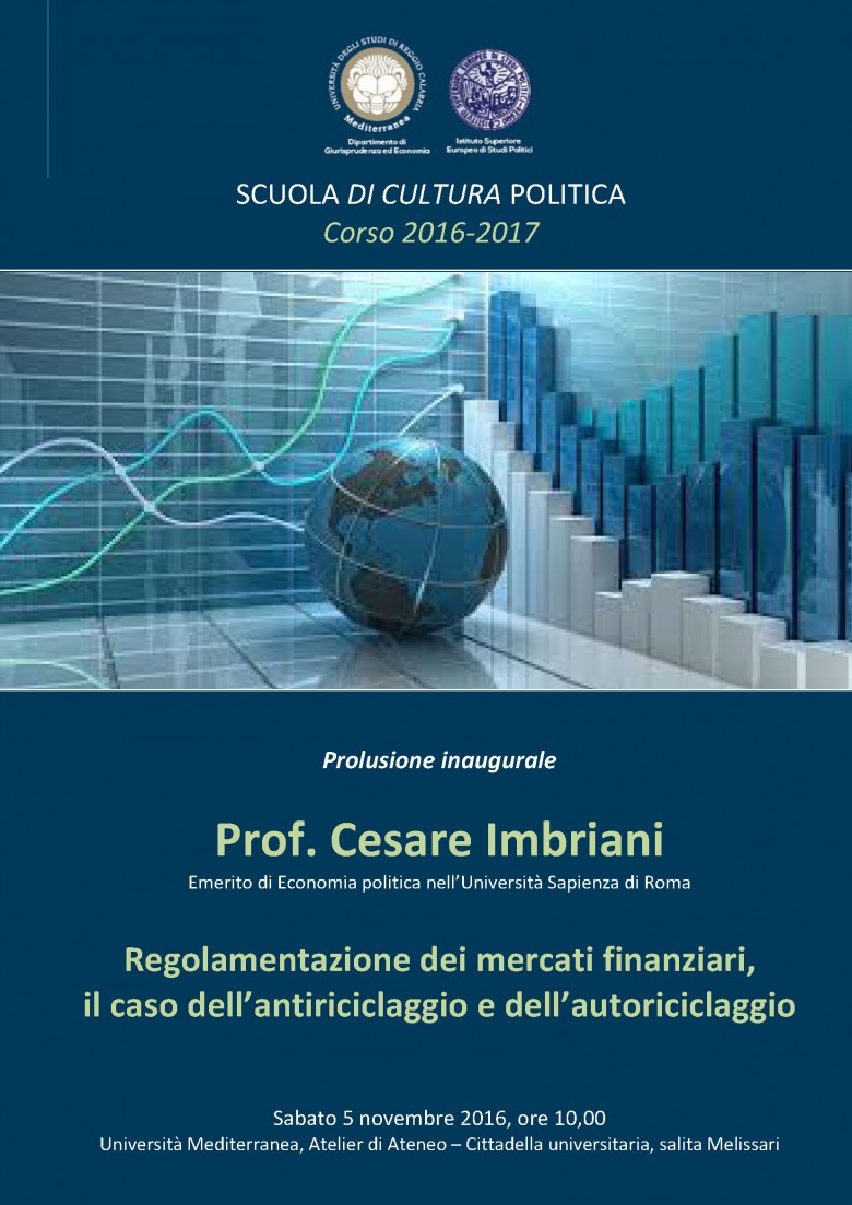 Il 5 novembre alle ore 10,00, presso l'Atelier di Architettura si svolgerà la prolusione inaugurale del corso 2016-2017 della Scuola di cultura politica che l'Istituto superiore europeo di studi politici organizza in collaborazione col Dipartimento di Giurisprudenza ed Economia. A tenere a battesimo il corso un relatore d'eccezione, il prof. Cesare Imbriani, emerito di economia politica nell'Università Sapienza di Roma, che tratterà un tema di grande attualità: Regolamentazione dei mercati finanziari, il caso dell’antiriciclaggio e dell’autoriciclaggio.