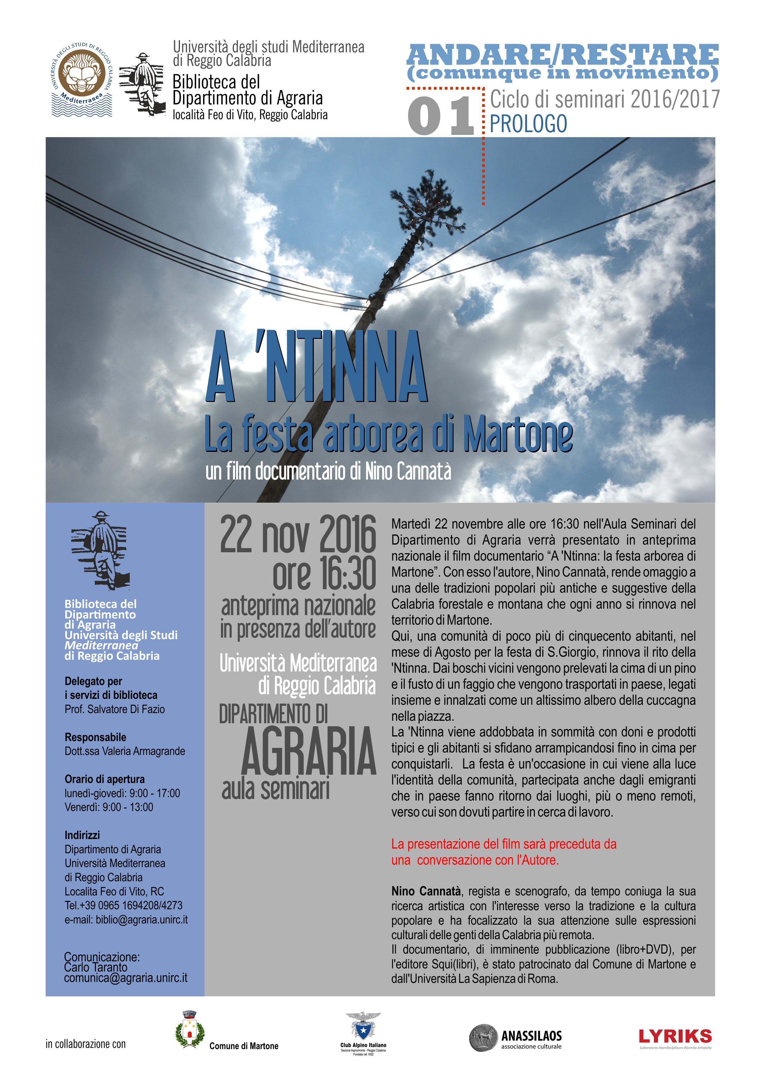 Martedì 22 novembre alle ore 16:30 nell’Aula Seminari del Dipartimento di Agraria (loc.Feo di Vito) verrà presentato in anteprima nazionale il film documentario “A ’Ntinna: la festa arborea di Martone”. Con esso l’autore, Nino Cannatà, rende omaggio a una delle tradizioni popolari più antiche e suggestive della Calabria forestale e montana che ogni anno si rinnova nel territorio di Martone. Qui, una comunità di poco più di cinquecento abitanti, nel mese di Agosto per la festa di S.Giorgio, rinnova il rito della ‘Ntinna. Dai boschi vicini vengono prelevati la cima di un pino e il fusto di un faggio, essi vengono poi trasportati in paese, legati insieme e innalzati come un altissimo albero della cuccagna nella piazza. La ’Ntinna viene addobbata in sommità con doni e prodotti tipici e gli abitanti si sfidano arrampicandosi fin sulla cima per conquistarli. La festa è un’occasione in cui l’identità della comunità viene riportata alla luce, partecipata anche dagli emigranti che in paese fanno ritorno. Il film di Cannatà documenta con grande sensibilità le diverse fasi del rito e della festa, raccogliendo le testimonianze dirette dei protagonisti e facendo emergere – attraverso le azioni e i gesti che vi osserviamo - un’anima profonda e antica, ancora viva tra gli abitanti di Martone.