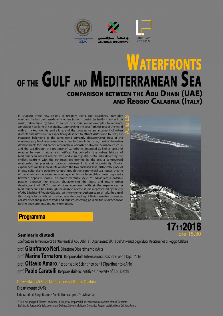 Nell’ambito del confronto attivato sul tema di ricerca “Waterfronts of the Gulf and Mediterranean Sea, comparison between the Abu Dhabi (UAE) and Reggio Calabria (Italy)” tra il Dipartimento dArTe -dell’Università Mediterranea di Reggio Calabria e l’Università di Abu Dabhi, il 17 novembre alle ore 15:30 presso l’aula L8 di Architettura, si terrà il primo seminario di studi.
