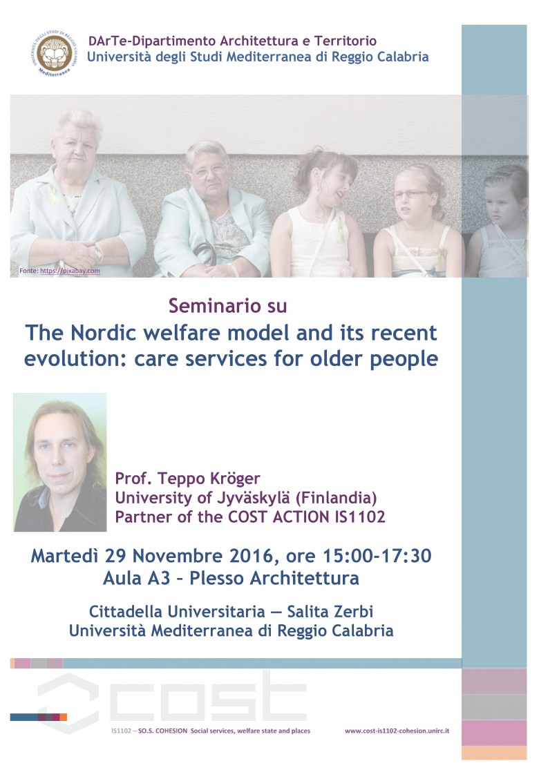 Il 29 novembre alle ore 15,00, nell’Aula A3 del plesso Architettura (piano terra), il professor Teppo Kröger dell’Università di Jyväskylä (Finlandia) terrà un seminario su The Nordic welfare model and its recent evolution: care services for older people. Il seminario si svolgerà in lingua inglese.