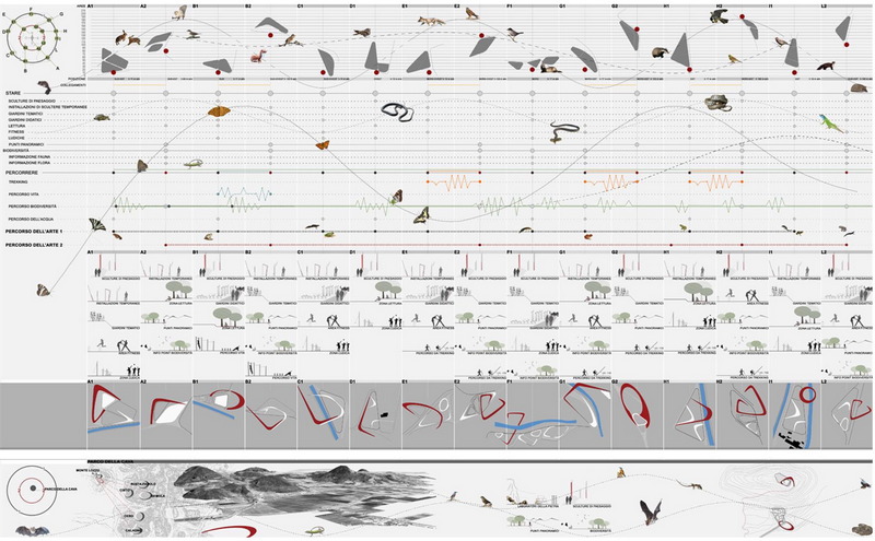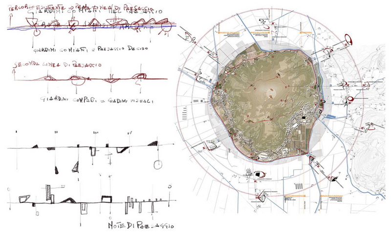 Il progetto di paesaggio per l’intero colle della città di Lozzo è un sistema che lega una serie di giardini compatti che cingono la città, formando quasi una “fortificazione” di paesaggio attraverso l’individuazione di punti strategici per la città. Questo primo cerchio si raddoppia su un livello intermedio del colle, costituendo una rete di giardini compatti che rappresentano delle note di paesaggio per l’intero territorio. Il disegno di questa strategia si è concretizzato in una mappa strategica di progetto, in cui geografia territoriale, identità di paesaggio, ricercatezza ecologica, processo di resilienza di paesaggio, hanno trovato una sintesi formale dinamica e comunicativa.