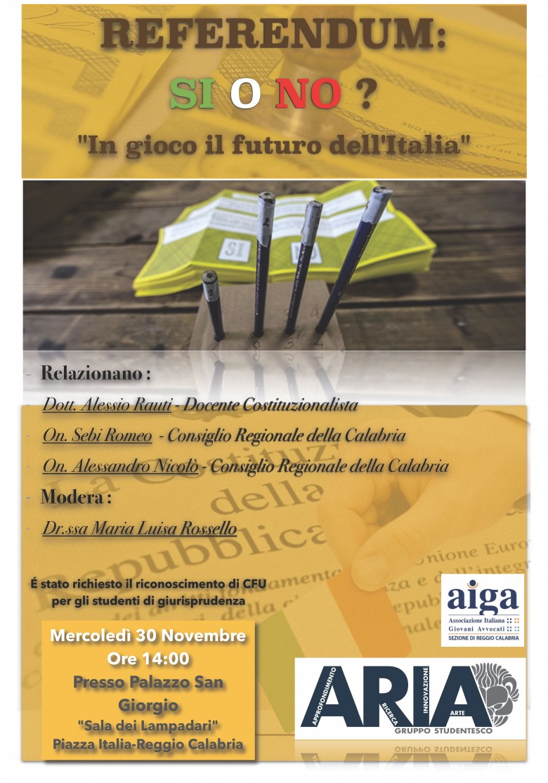 Il convegno REFERENDUM COSTITUZIONALE SI O NO? In gioco il futuro dell’Italia, si terrà mercoledì 30 novembre alle ore 14:00, presso la Sala dei Lampadari di Palazzo San Giorgio con il patrocinio dell'AIGA (Associazione Italiana Giovani Avvocati).