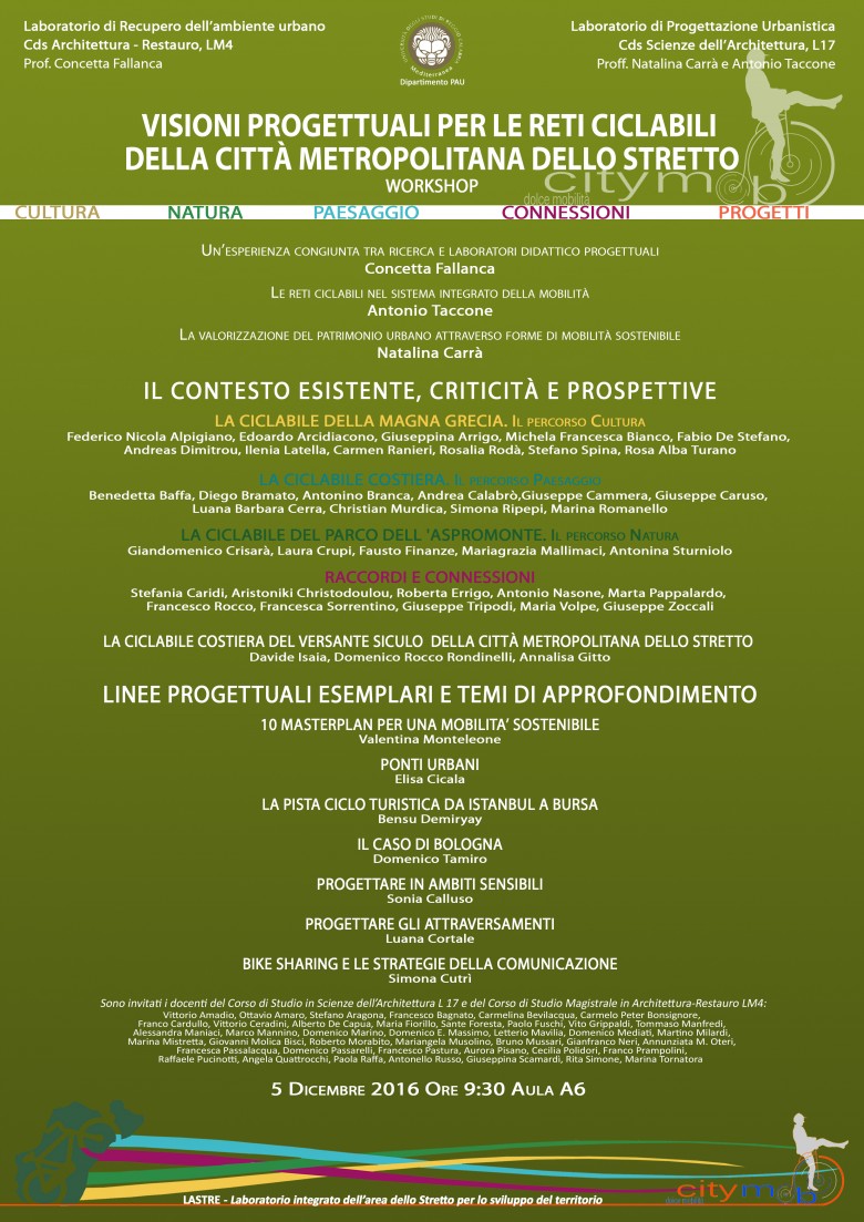 Il prossimo 5 dicembre alle 9,30, presso l’Aula A6 della sede di Architettura dell’Università Mediterranea di Reggio Calabria, si terrà il workshop “Visioni progettuali per le reti ciclabili della Città Metropolitana dello Stretto”, giornata di studio e confronto sui percorsi progettuali dei Laboratori di Recupero dell’Ambiente Urbano (prof. Concetta Fallanca) e di Progettazione Urbanistica (proff. Natalina Carrà e Antonio Taccone).