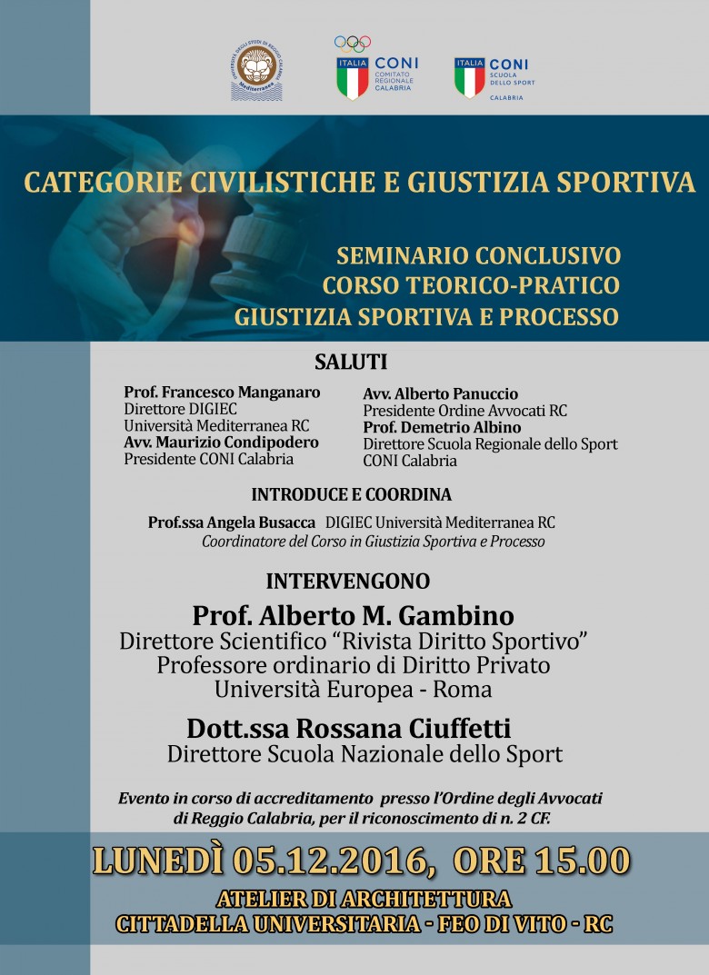 Si svolgerà lunedì 5 dicembre alle ore 15, presso l'Atelier di Architettura, il seminario conclusivo della prima edizione del corso teorico-pratico in Giustizia Sportiva e Processo organizzato dal Dipartimento di Giurisprudenza ed Economia in collaborazione con il CONI Calabria e con la Scuola Regionale dello Sport.