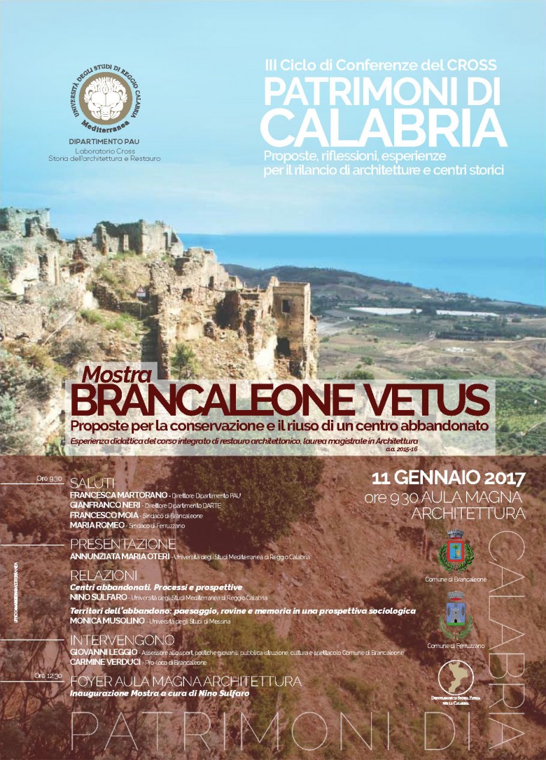 Nell’ambito dell’iniziativa del Laboratorio Cross dedicata a Patrimoni di Calabria. Proposte, riflessioni, esperienze per il rilancio di architetture e centri storici il giorno 11 gennaio 2017 si inaugurerà, nel foyer dell’aula magna di Architettura, la mostra Brancaleone vetus. Proposte per la conservazione e il riuso di un centro abbandonato, che raccoglie gli esiti delle esercitazioni degli studenti del corso di laurea quinquennale in Architettura nell’ambito del corso integrato di restauro architettonico tenuto dalla professoressa Annunziata Maria Oteri (a.a. 2015-16).