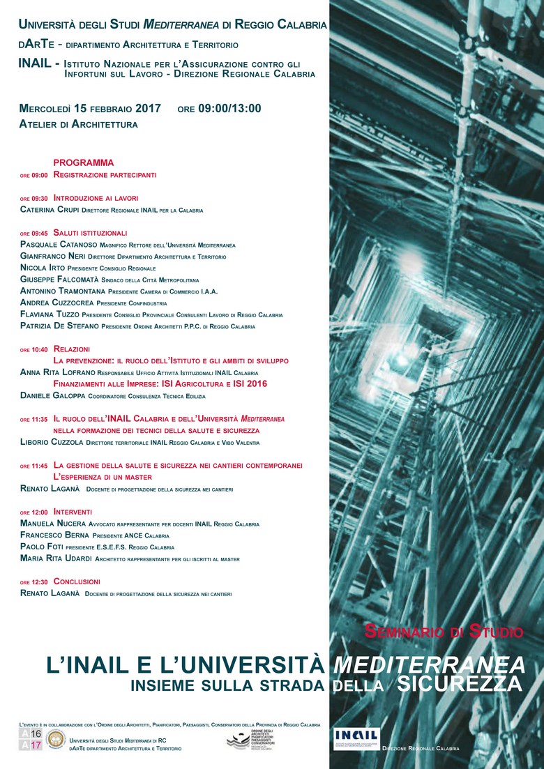 Mercoledì 15 febbraio 2017 si terrà - dalle 9.00 alle 13.00 -presso l’Atelier di Architettura, un importante appuntamento, dal titolo “L'Inail e l’Università Mediterranea insieme sulla strada della sicurezza”, promosso dall’INAIL – Direzione Regionale della Calabria, dal Dipartimento dArTe dell’Università degli Studi Mediterranea di Reggio Calabria e dall’Ordine degli Architetti Pianificatori Paesaggisti e Conservatori della Provincia di Reggio Calabria.
