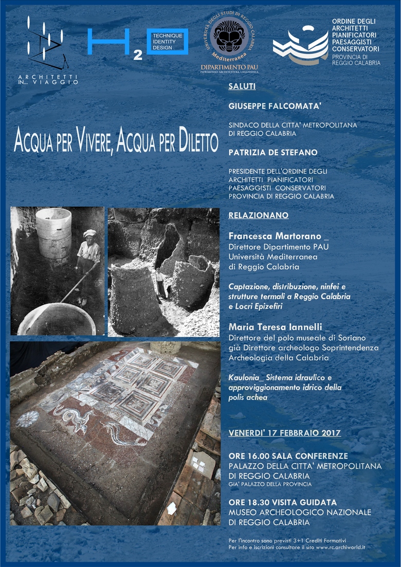 Apre il ciclo la prof.ssa Francesca Martorano, direttore del Dipartimento PAU, con la conferenza ACQUA PER VIVERE, ACQUA PER DILETTO. Captazione, distribuzione, ninfei e strutture termali a Reggio Calabria e Locri Epizefiri, che illustrerà, attraverso l’esame dei dati archeologici effettuati a partire dalla fine dell’Ottocento, le risorse idriche delle poleis di Locri Epizephiri e Reggio in età greca e in età romana.