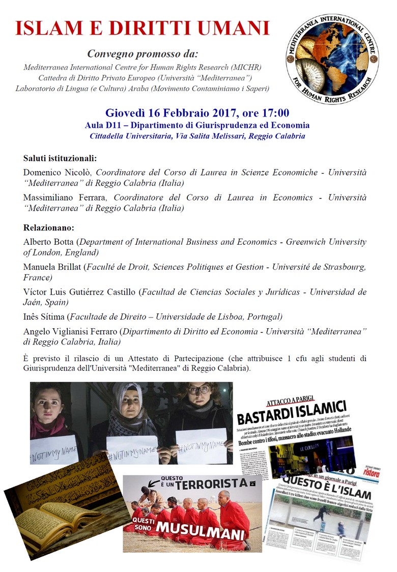 Il MICHR (Mediterranea International Centre for Human Rights Research), in collaborazione con la Cattedra di Diritto Privato Europeo dell'Università Mediterranea ed il Laboratorio di Lingua (e Cultura) Araba del Movimento universitario Contaminiamo i Saperi, propone un Convegno internazionale su "Islam e Diritti umani".