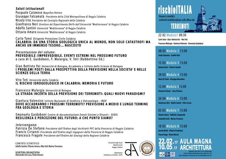 Il ciclo di seminari "Rischio Italia", organizzato dal Dipartimento DArTe del nostro Ateneo, si inquadra in questo contesto e vuole promuovere un dibattito multidisciplinare sul tema del rischio e della prevenzione. I seminari, rivolti a professionisti e studenti, saranno tenuti da alcuni tra i maggiori esperti italiani del settore e hanno lo scopo di contribuire a formare una consapevole e condivisa coscienza del pericolo e del conseguente rischio, mostrando che, pur nella loro ineluttabilità, dai terremoti ci si può e ci si deve difendere.