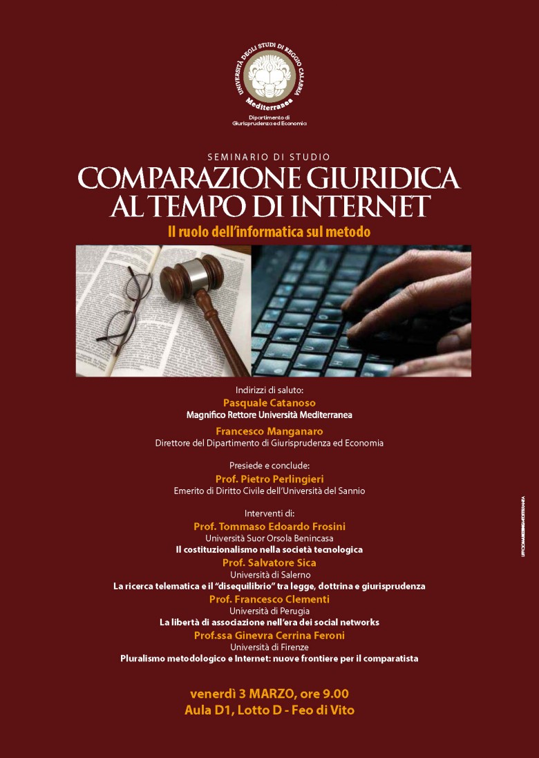 Venerdì 3 marzo alle ore 9.00, presso l'aula D1 del Lotto D, si terrà il seminario di studio: "Comparazione giuridica al tempo di Internet. Il ruolo dell'informatica sul metodo".