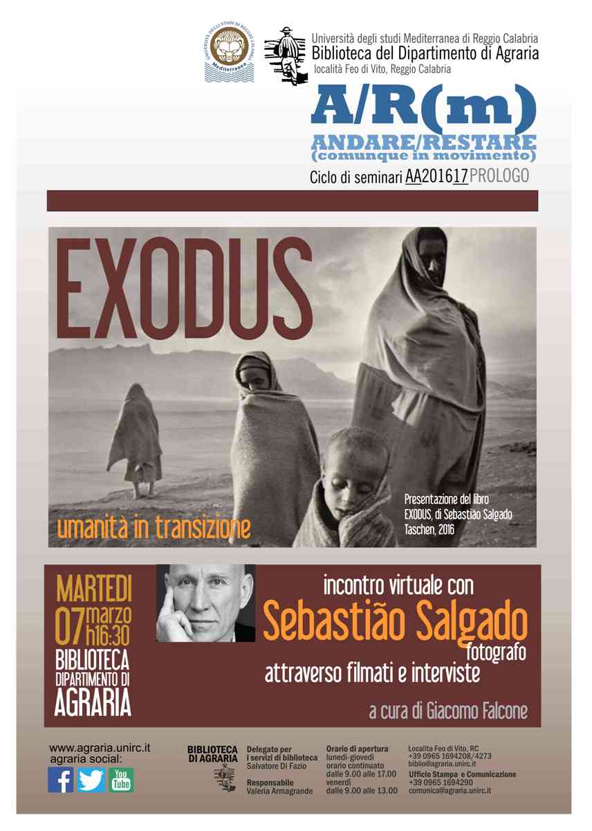 Prosegue il ciclo di seminari “Andare/Restare: comunque in movimento” promosso dalla Biblioteca del Dipartimento di Agraria. Martedì 7 marzo alle 16 e 30, il terzo seminario proposto avrà per tema “EXODUS: umanità in transizione”. Attraverso filmati, interviste, fotografie si entrerà nel mondo e nella visione di Sebastiao Salgado, economista e fotografo brasiliano, noto anche per “Il sale della terra”, il film-documentario che recentemente Wim Wenders ha dedicato alla sua vita e alla sua opera. L’incontro virtuale con Salgado sarà guidato da Giacomo Falcone, anche egli fotografo e dottore di ricerca nel settore dell’Economia agraria. Il seminario sarà accompagnato da una mostra di alcune delle foto di Salgado pubblicate da Taschen.