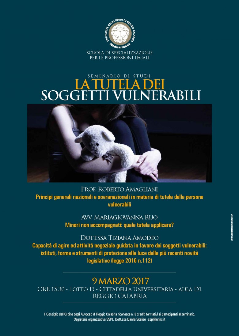 Giovedì 9 marzo, ore 15.30, si svolgerà presso l’Aula D1 (Lotto D) della Cittadella Universitaria il seminario di studi La tutela dei soggetti vulnerabili organizzato nell’ambito delle attività programmate dalla Scuola di Specializzazione per le professioni legali.