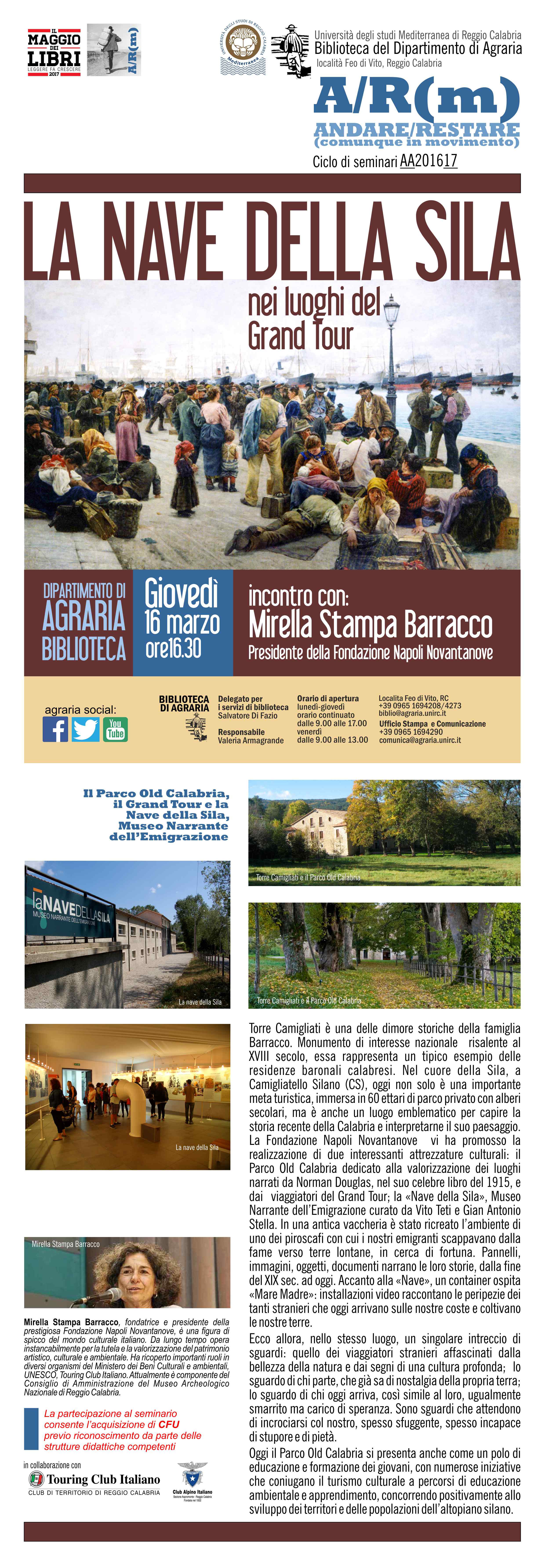 Il titolo del seminario, “La Nave della Sila nei luoghi del Grand Tour” ruota intorno a un luogo strettamente legato alla famiglia Barracco, la storica dimora di Torre Camigliati, e alle iniziative che Napoli Novantanove vi ha promosso. Monumento di interesse nazionale, risalente al XVIII secolo, Torre Camigliati è un tipico esempio delle residenze baronali calabresi. Nel cuore della Sila, a Camigliatello Silano (CS), oggi non solo è una importante meta turistica, immersa in 60 ettari di parco privato con alberi secolari, ma è anche un luogo emblematico per capire la storia recente della Calabria e per interpretarne il suo paesaggio. La Fondazione Napoli Novantanove vi ha promosso la realizzazione di due interessanti attrezzature culturali: il Parco Old Calabria dedicato alla valorizzazione dei luoghi narrati da Norman Douglas, nel suo celebre libro del 1915, e dai viaggiatori del Grand Tour; la «Nave della Sila», Museo Narrante dell’Emigrazione curato da Vito Teti e Gian Antonio Stella. In una antica vaccheria è stato ricreato l’ambiente di uno dei piroscafi con cui i nostri emigranti scappavano dalla fame verso terre lontane, in cerca di fortuna. Pannelli, immagini, oggetti, documenti narrano le loro storie, dalla fine del XIX sec. ad oggi. Accanto alla «Nave», un container ospita «Mare Madre»: installazioni video raccontano le peripezie dei tanti stranieri che oggi arrivano sulle nostre coste e coltivano le nostre terre.