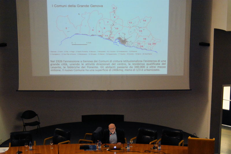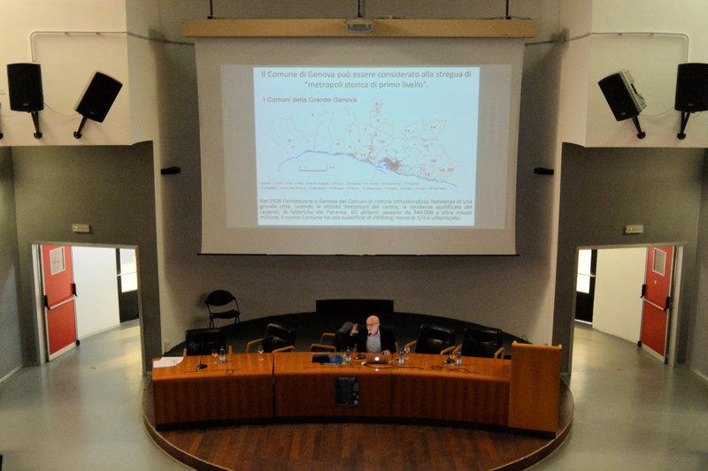 Il suo intervento è stato strutturato in più punti dove sono stati descritti: l'anomalia genovese e le metropoli possibili; le morfologie e gli insediamenti del territorio; il paesaggio; i due “lobi” della metropoli; gli anni della crisi e la ricerca di nuovo sviluppo verso prove di piano.