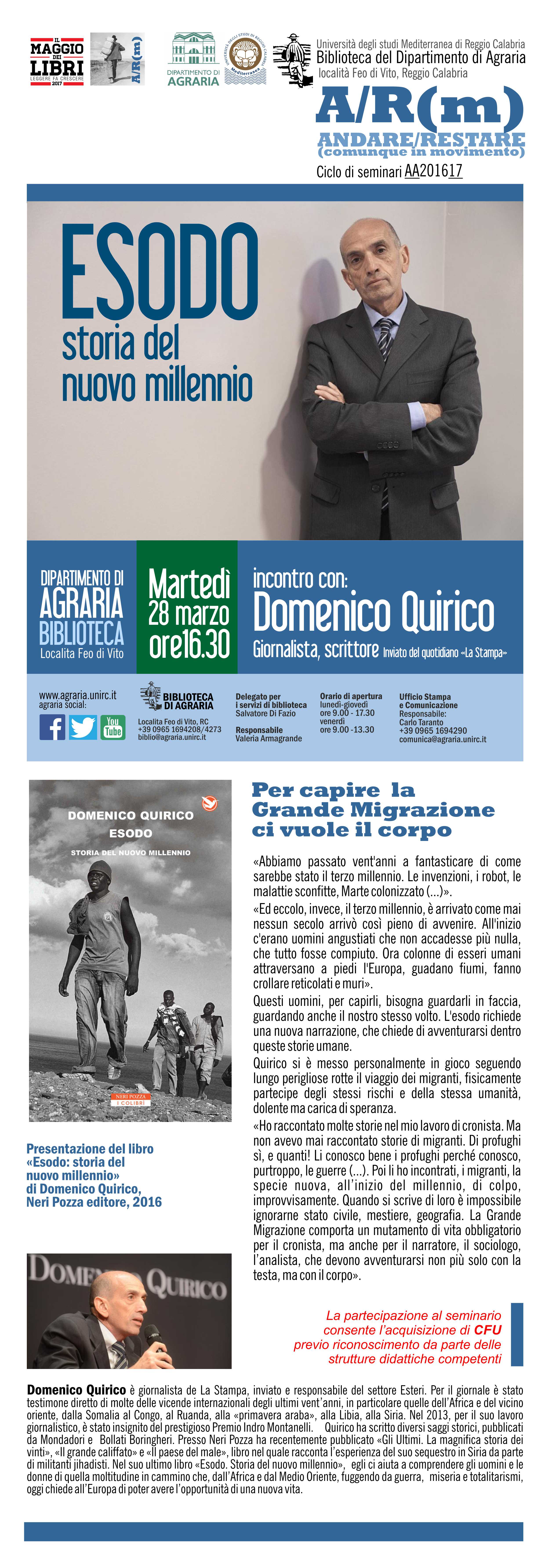 Martedì 28 marzo alle ore 16 e 30 avrà luogo il secondo seminario del ciclo “A/R(m): Andare/Restare (comunque in movimento)” promosso dalla Biblioteca del Dipartimento di Agraria dell’Università Mediterranea di Reggio Calabria (località Feo di Vito, Reggio Calabria). Relatore sarà Domenico Quirico, giornalista e scrittore, oggi considerato uno dei più importanti reporter internazionali.