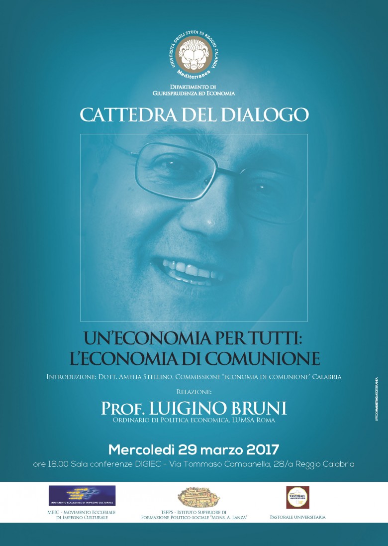 Il 29 marzo, alle ore 18.00, il prof. Luigino Bruni (ordinario di Politica economica, Università Lumsa di Roma) terrà una conferenza sul tema “Un’economia per tutti: l’economia di comunione”.