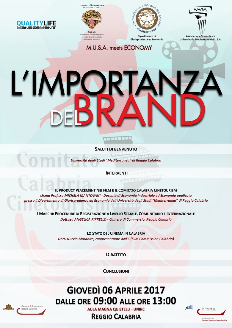 Giovedì 6 aprile alle 9:00, in aula Magna "A. Quistelli" si terrà il convegno "L'importanza del brand", organizzato dall'Associazione Studentesca Universitaria Mediterranea "M.U.S.A." in collaborazione con le cattedre di Economia Applicata ed Economia Industriale del corso di laurea in Scienze Economiche, il Cat Lab ed il Quality Management, e con la Camera di Commercio di Reggio Calabria, nelle persone delle loro rappresentanti, rispettivamente, la prof.ssa Michela Mantovani, protagonista di sempre più numerose iniziative nel nostro Ateneo che coinvolgono pure i suoi studenti dell'alternanza Scuola-Lavoro, e, per l'ultima, la dott.ssa Angelica Pirrello.; entrambe, saranno relatrici all'iniziativa, assieme al terzo ospite, il dott. Nuccio Morabito, rappresentante dell'Anec (Film Commission Calabria), ed al quarto, Luis Brito, secondo campione mondiale di kite surf.
